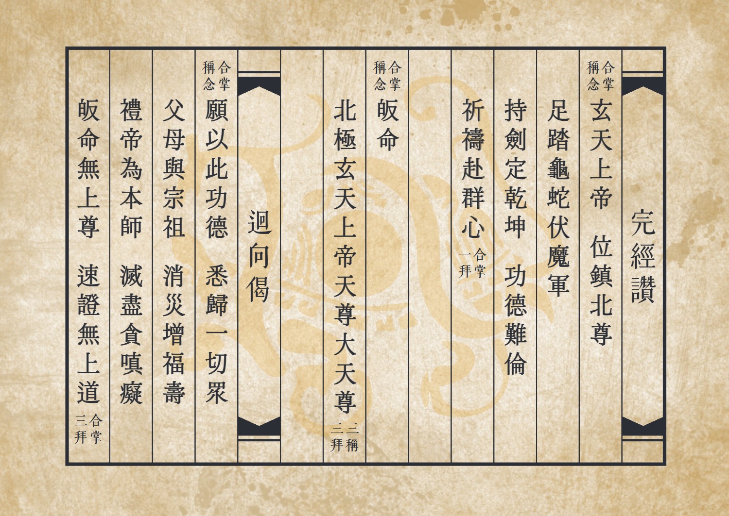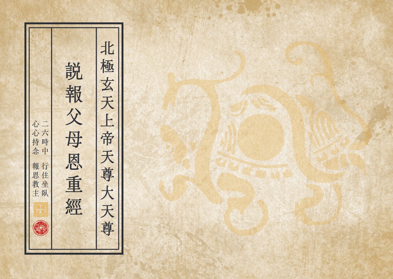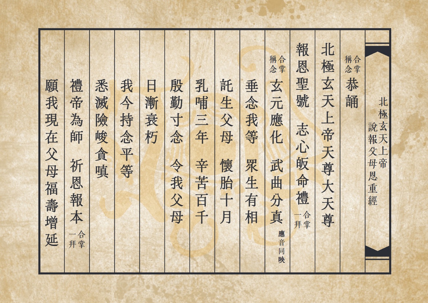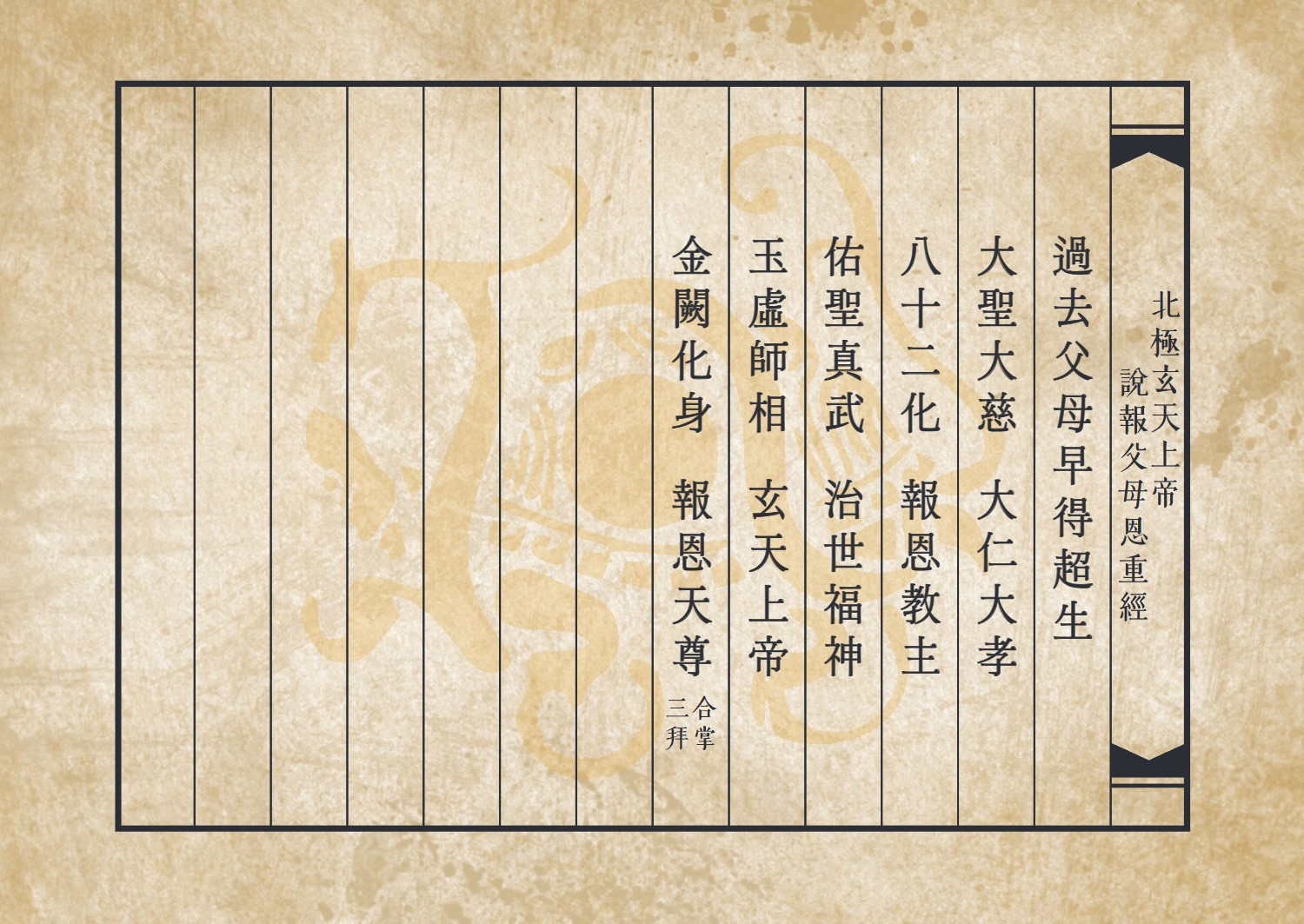 玄天上帝學道不忘報本,道成拔度父母超升天界,位列仙班。後人感玄帝孝敬父母之心,於是在供奉玄帝的地方,都供奉聖父、聖母。告誡天下眾生禮帝為師,不忘父母養育深恩。