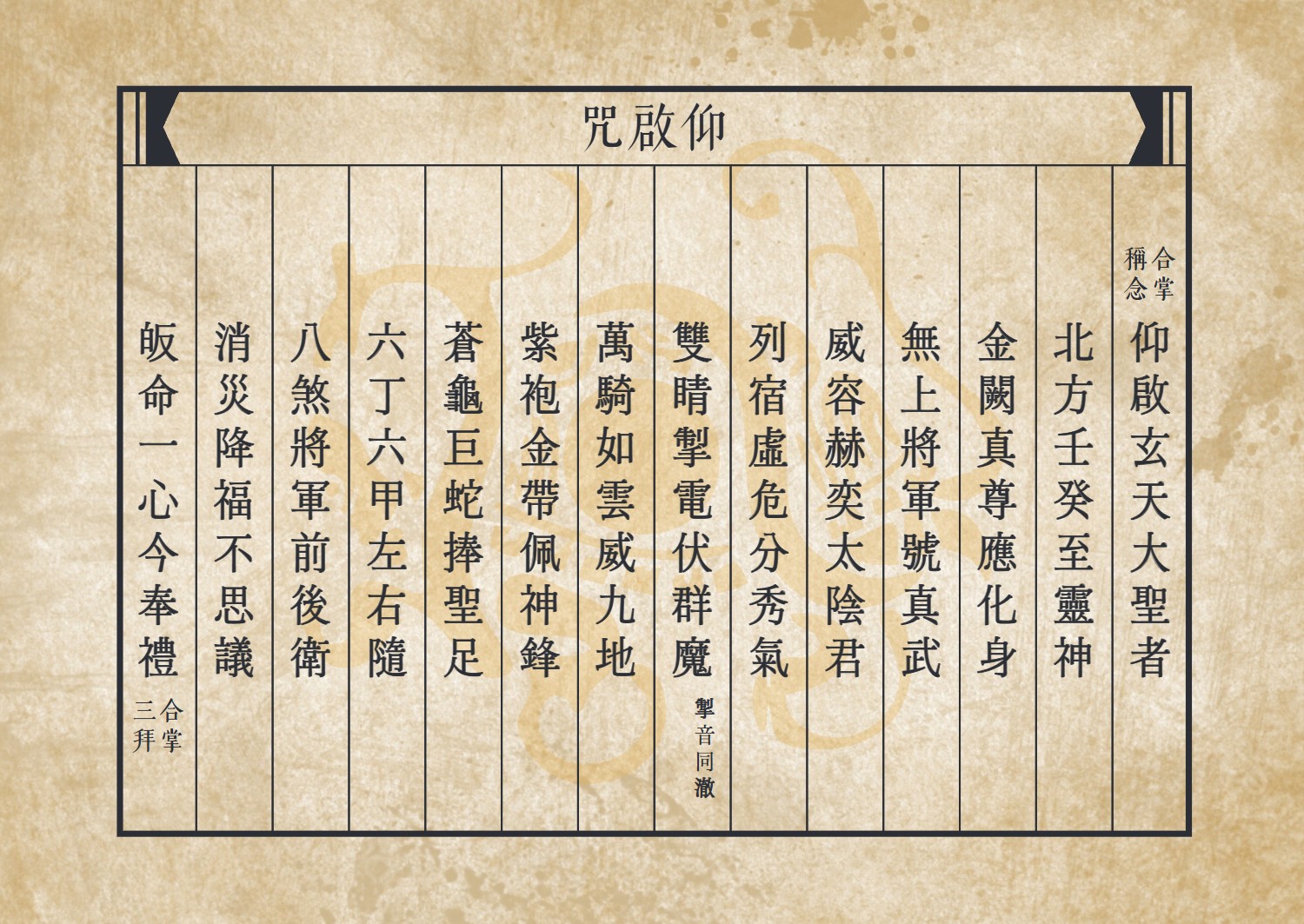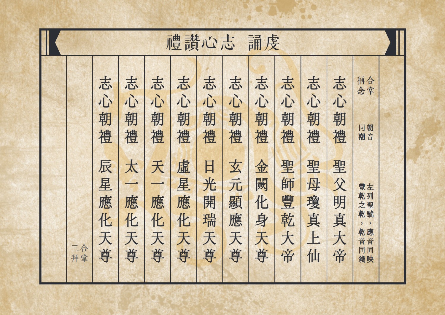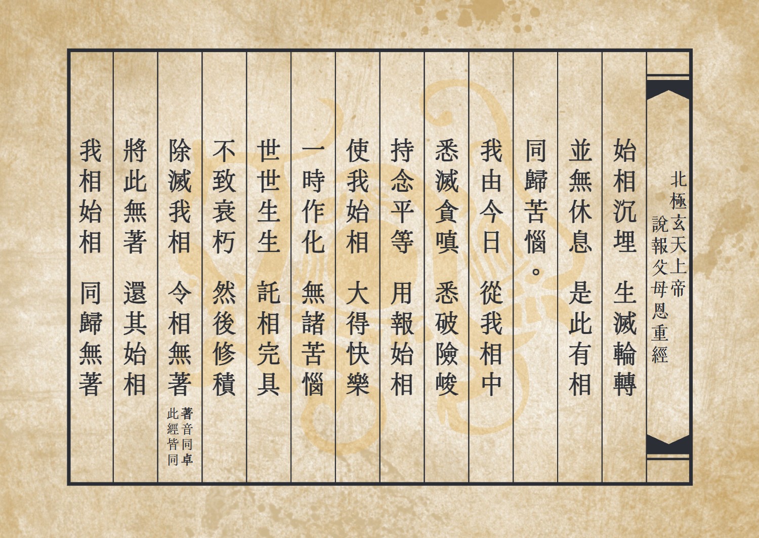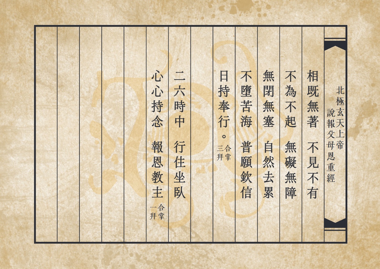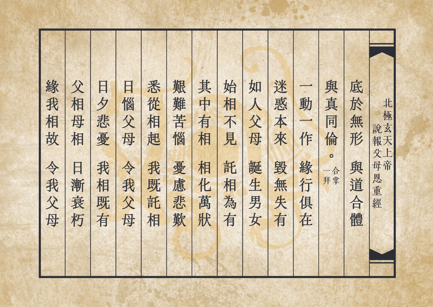 玄天上帝學道不忘報本,道成拔度父母超升天界,位列仙班。後人感玄帝孝敬父母之心,於是在供奉玄帝的地方,都供奉聖父、聖母。告誡天下眾生禮帝為師,不忘父母養育深恩。