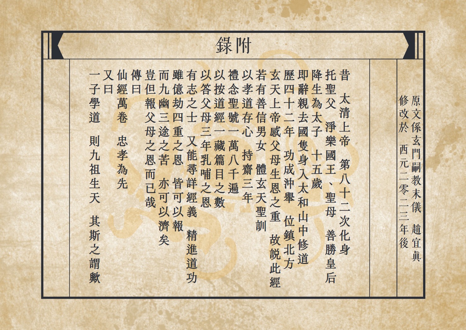 傳曰:仙經萬卷,忠孝為先。又曰:一子學道,則九祖生天。其斯之謂歟。