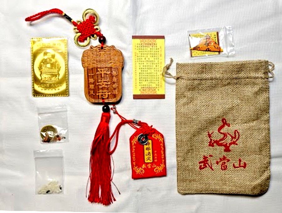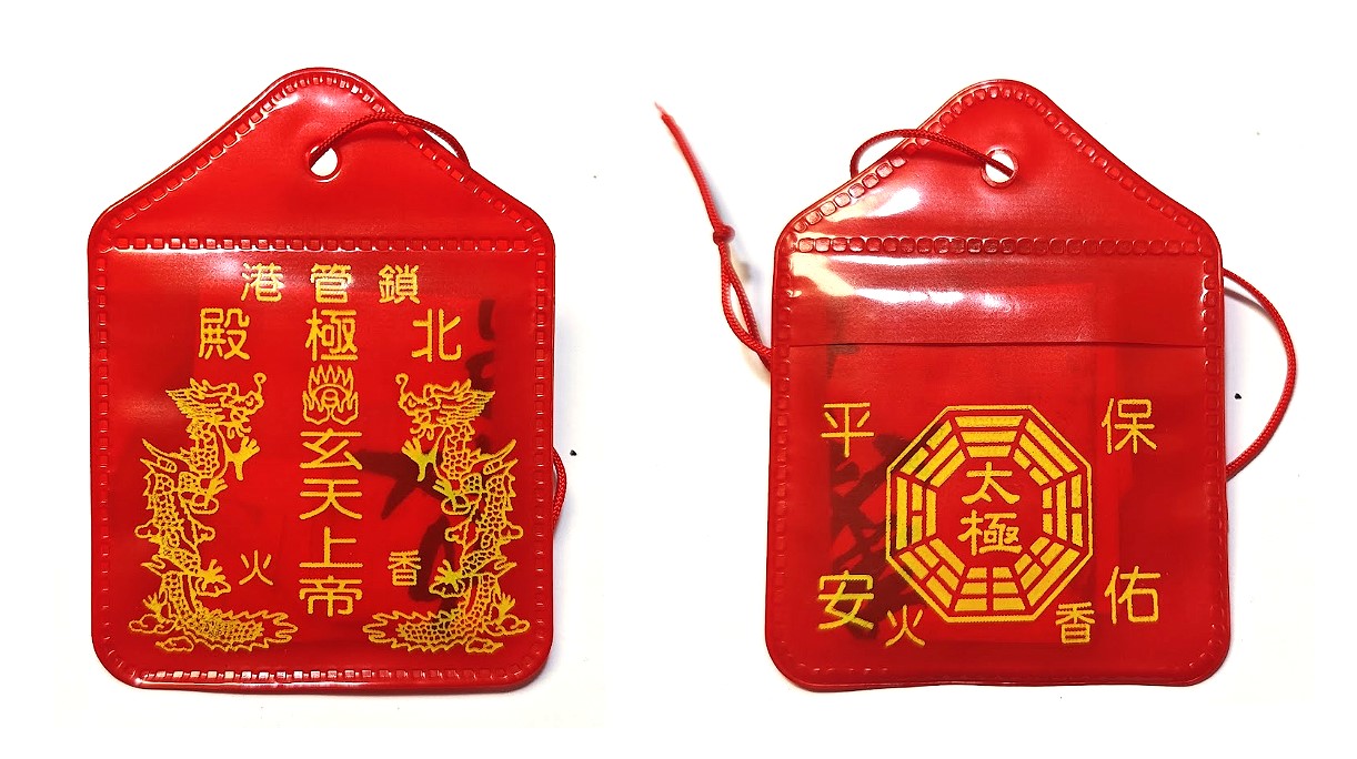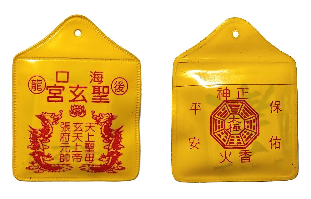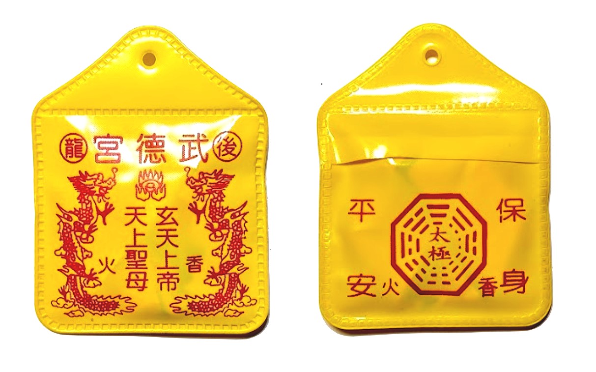 一般的香火袋,其內容主要有:廟宇主神的符令,並有主神蓋的紅印;或是含有主爐的香灰(香火)。早期常用寫有神明名諱的紅布袋來裝填。後來現代印刷紙張技術及塑膠套的大量生產,才開始流行以印有神明相片的小型塑膠套填裝。並會加上一條紅棉繩,方便信眾穿繩懸掛於脖子上,或是懸吊於轎車、貨車等,作為日常保身平安或行車出入平安。倘若居家沒有空間安奉神像,或是尚不方便供奉神明者,一般可以先以神明的香火袋來祈求加以庇佑。當信眾向神明祈取香火袋保身平安時,可以隨個人財力與心意,隨喜敬獻香油錢或功德金。香火袋一般除了印有神明圖像的紙卡外,其內容中至為重要的,便是一張黃色的平安符了。平安符為道教和民間信仰常用的符令或靈符之一,不分男女老少,常為隨身保佑平安之用,而有護身平安符之稱;若用為鎮宅之平安符,則稱鎮宅平安符。符令是一種具有驅邪除祟功能的宗教性圖文,在儀式中通常與咒語同時使用,並稱為符咒,用來作為溝通神鬼的重要媒介。傳統上符令多由法師親手繪製,但臺灣寺廟為了因應眾多民眾的需求,多以版印方式印製符令,然後再蓋上鐫刻神祇名諱或宮廟名稱的朱印,而許多早期的木雕符令印版而成為精緻的民俗工藝。